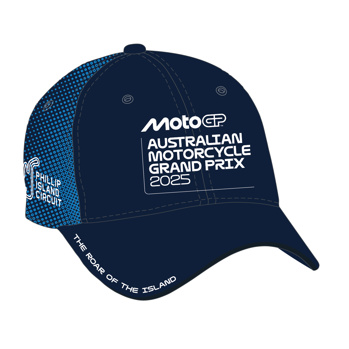 The 2025 Australian Motorcycle Grand Prix Sublimated Blur Cap features the official event logo to the front, and is complimented by the event slogan on the right edge of the peak.