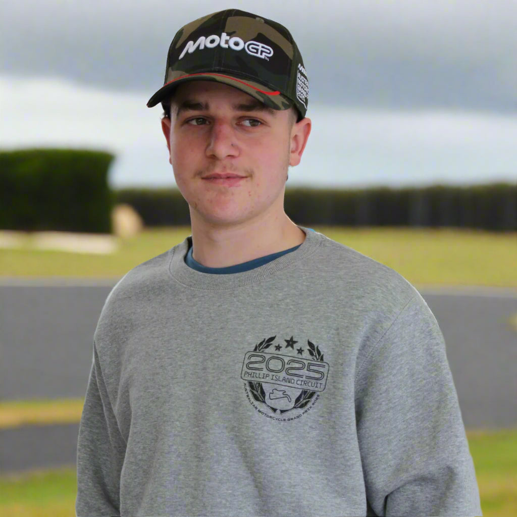 The 2025 Australian Motorcycle Grand Prix Adult Crew Neck Jumper is a comfortably casual addition to the range and features a left hand black print of this years Wreath design.